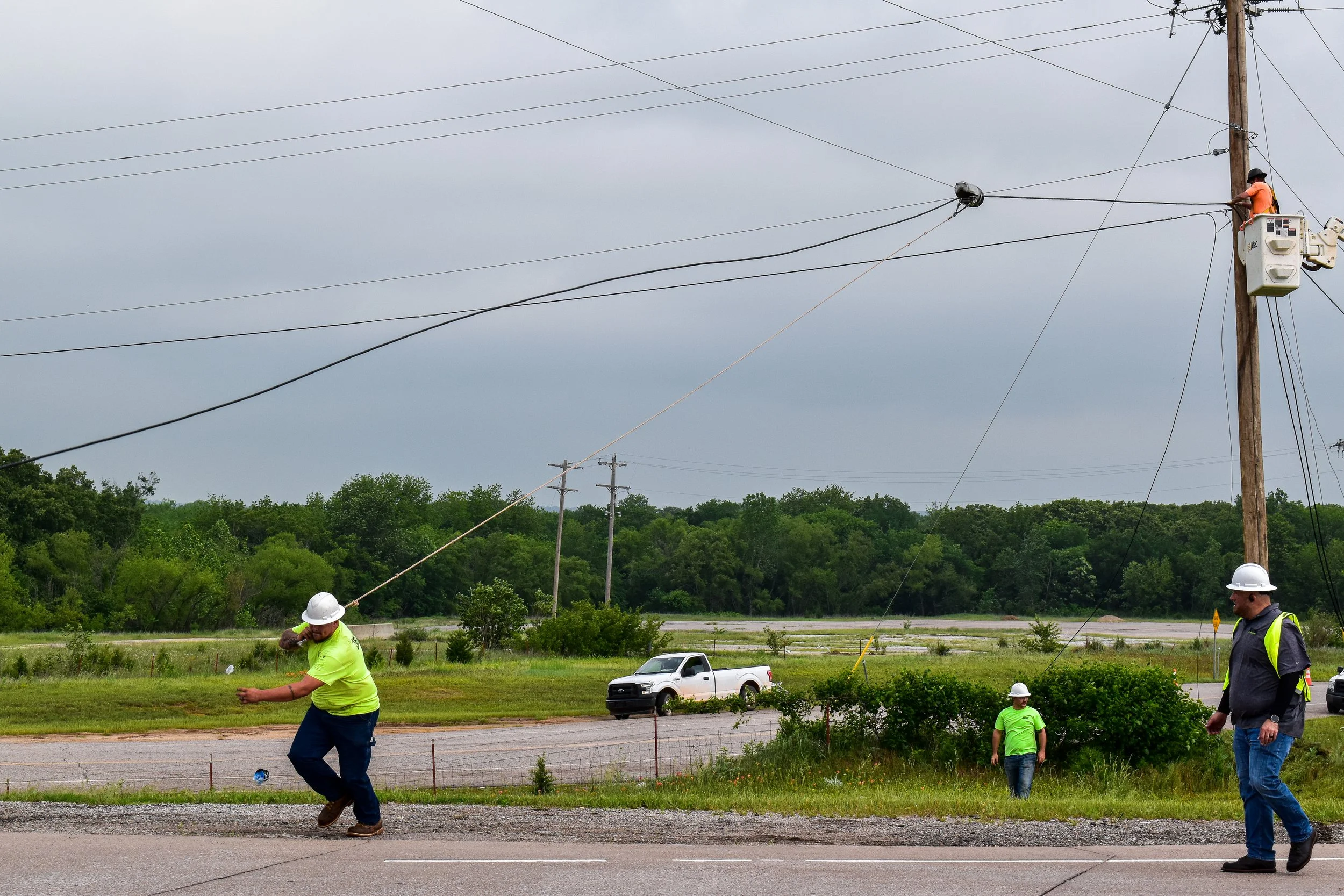 CVEC Fiber contractor Brandon Benham (below) manually lashes the fiber, while Chris Patrick works from the bucket, and Tanner Jones and Josh Ciaramita work on the ground as they hang mainline fiber across I-40.