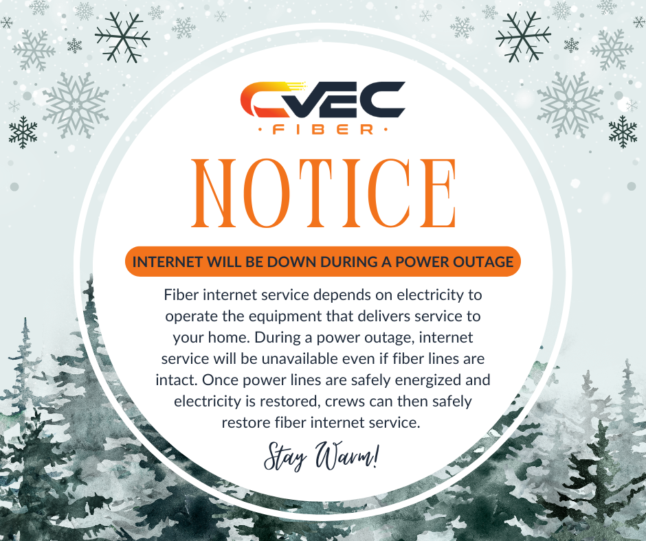 As part of our preparation, we want to share an important reminder for customers. While outages are not anticipated, winter weather can be unpredictable. CVEC Fiber internet relies on electricity to power the equipment that delivers service to your home. If a power outage occurs, internet service may be interrupted. Once power is restored, our crews can safely restore fiber internet service